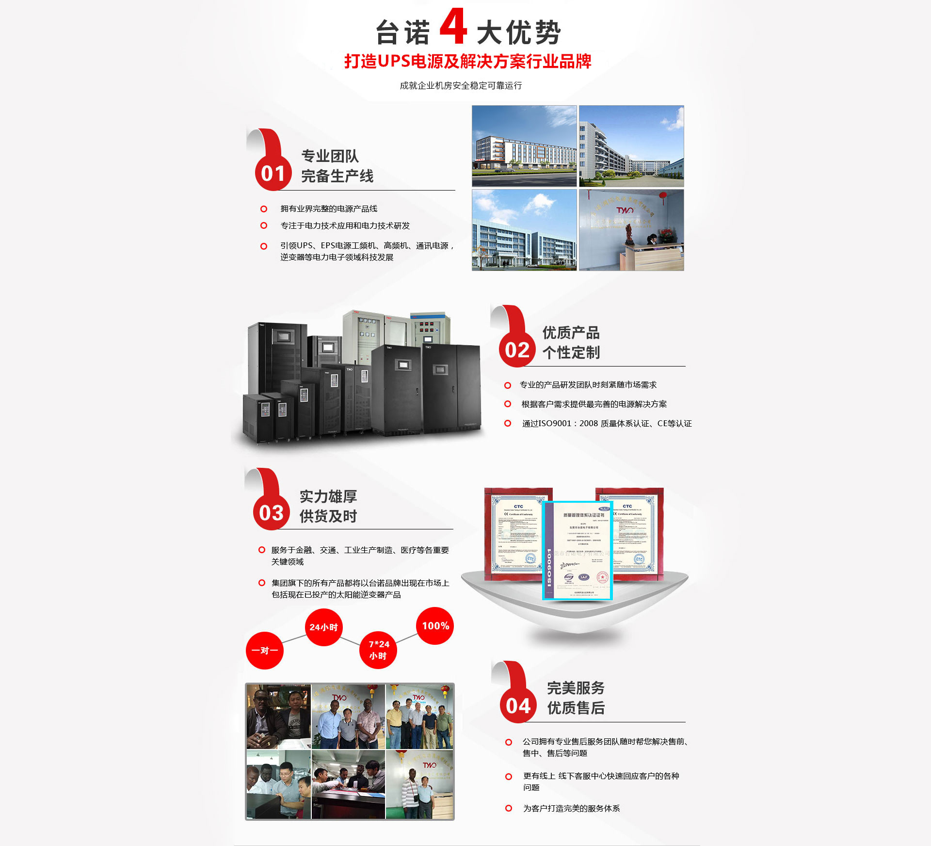 東莞市臺(tái)諾電子有限公司是一家以新能源、UPS不間斷電源、EPS應(yīng)急電源、交直流穩(wěn)壓電源、鉛酸免維護(hù)蓄電池、智能變頻電源、智能開(kāi)關(guān)電源、智能一體化逆變電源、智能電源監(jiān)控系統(tǒng)的研究、開(kāi)發(fā)、生產(chǎn)、經(jīng)營(yíng)、銷(xiāo)售及技術(shù)推廣等多行業(yè)發(fā)展高新企業(yè)。公司位于東莞市毗鄰中國(guó)南方經(jīng)濟(jì)重地廣州、深圳,交通發(fā)達(dá),信息暢通。系廣東重點(diǎn)高新技術(shù)企業(yè)、東莞市創(chuàng)新型企業(yè)、也是中國(guó)電源協(xié)會(huì)、廣東省材料與器件產(chǎn)業(yè)技術(shù)創(chuàng)新戰(zhàn)略聯(lián)盟、 東莞市臺(tái)諾電子有限公司隸屬于臺(tái)諾集團(tuán),是一家有多年UPS集設(shè)計(jì)研發(fā)、生產(chǎn)銷(xiāo)售、售后服務(wù)為一體的公司,擁有業(yè)界完整的電源產(chǎn)品線(xiàn),專(zhuān)注于電力技術(shù)應(yīng)用和電力技術(shù)研發(fā)。公司致力于向全世界客戶(hù)提供性能好、品質(zhì)好的產(chǎn)品與服務(wù)。UPS、EPS電源工頻機(jī)、高頻機(jī)、通訊電源、光伏、逆變器等電力電子領(lǐng)域科技發(fā)展,創(chuàng)造可靠、節(jié)能的產(chǎn)品,致力于為客戶(hù)提供完善的電源解決方案。產(chǎn)品廣泛應(yīng)用于政z府、金融、通信、教育、交通、氣象、廣播電視、...